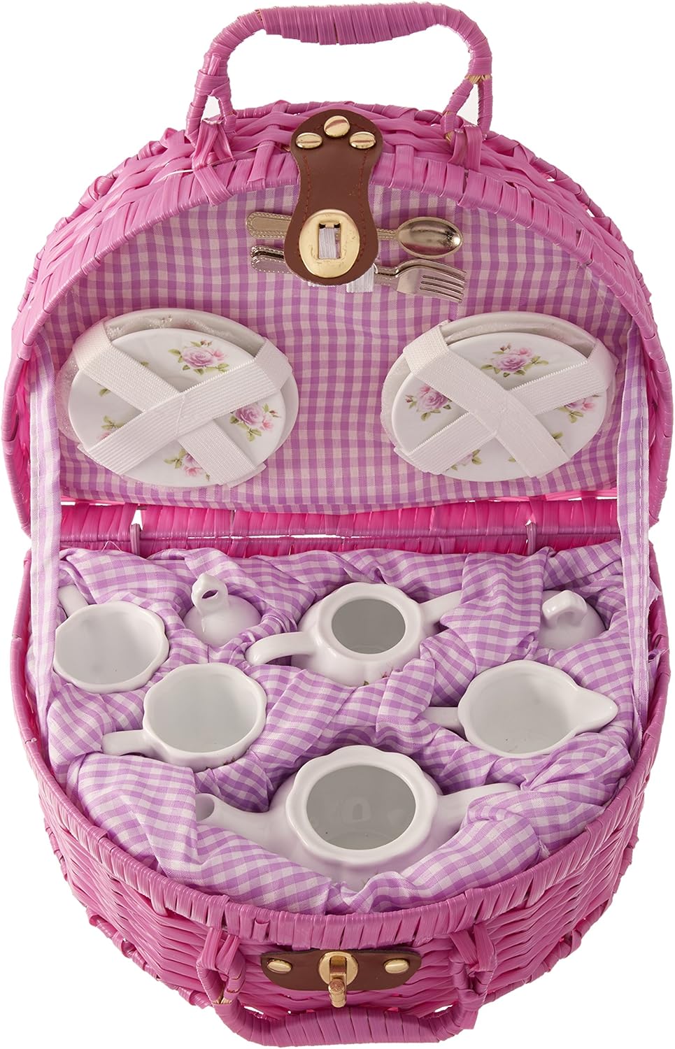 Will it be you and Teddy or you and Dolly? Everything you need for tea. A white porcelain tea set with Pink Rose Floral. Sure to delight any little girl. Comes in a wicker basket for carrying or storage. It includes a teapot, 2 cups and saucers, creamer and sugar, 2 dessert plates and utensils.